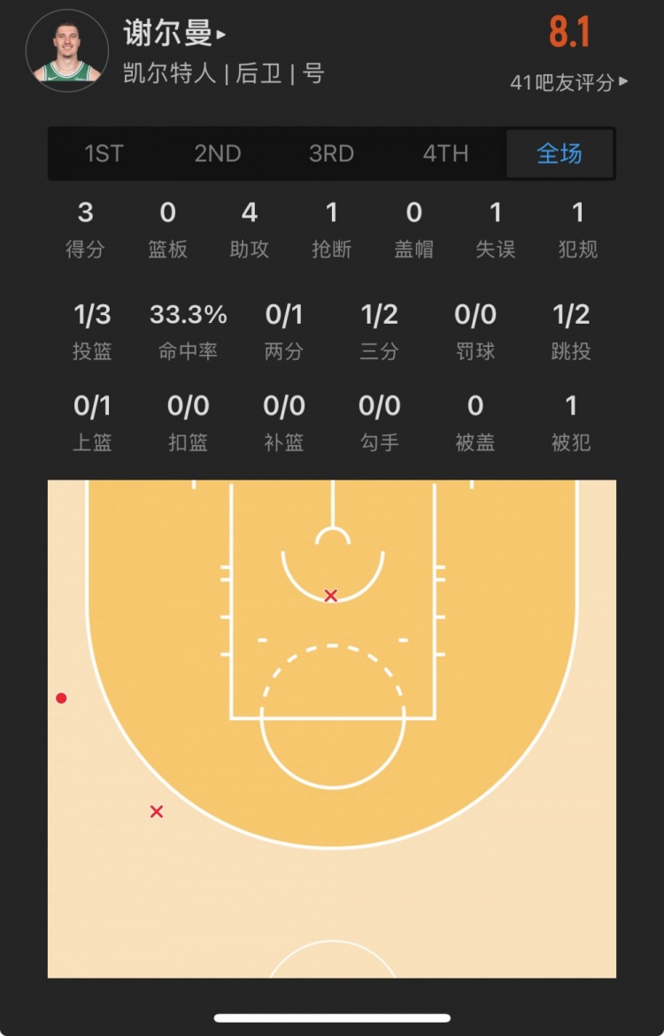 凯尔特人30号秀 贝勒-谢尔曼 登场12.7分钟