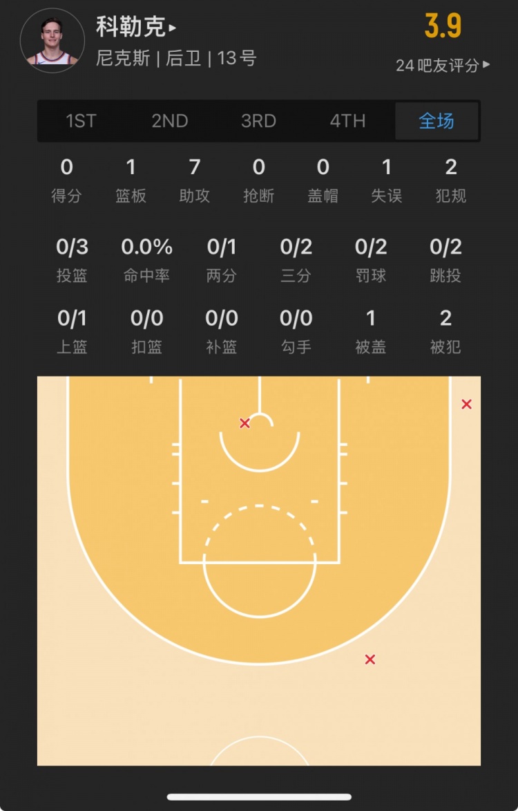 尼克斯34号秀 泰勒-科勒克 登场18.5分钟