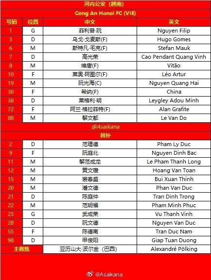 北京时间11月27日20:15,亚冠二级联赛小组赛第5轮,北京国安客场挑战河内公安,目前两队同积5分,此役是两队争夺出线权的关键一战,赛前双方首发阵容陆续公布:北京国安首发:河内公安首