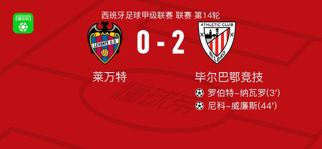毕尔巴鄂竞技20莱万特,罗伯特纳瓦罗破门,尼科威廉斯锁定胜局