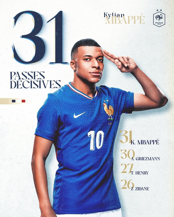 法国队官推写道:“历史助攻王诞生!在对阵西班牙的比赛中完成第31次助攻后,姆巴佩正式加冕法国国家队历史助攻王