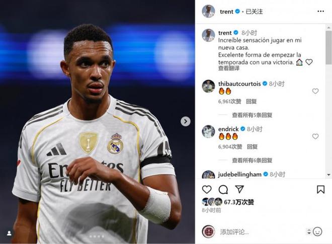阿诺德此役为皇马首发出战,上演西甲首秀,赛后他在社交媒体上庆祝胜利:“在我的新主场踢球感觉太棒了,胜利是开启新赛季的完美方式。”