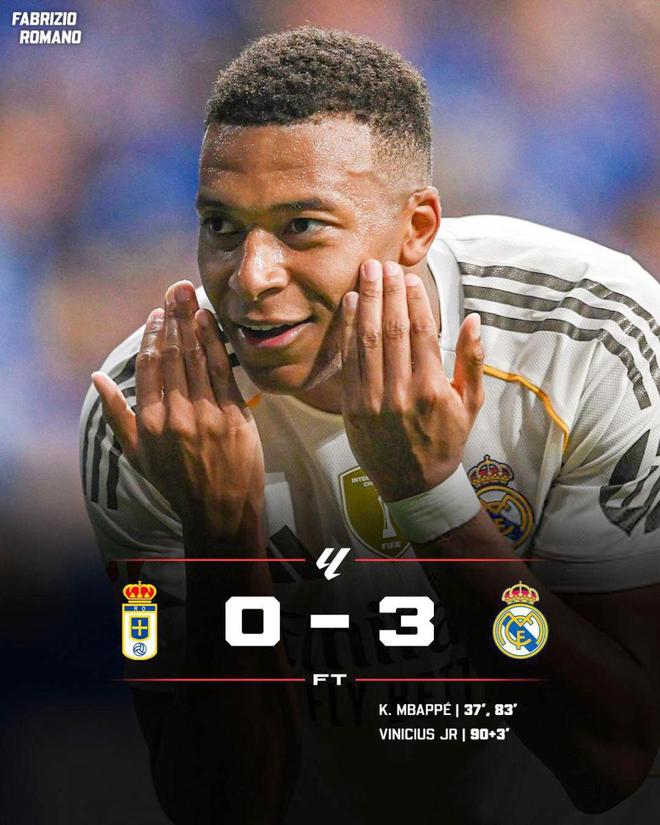 值得一提的是,皇马此前已经29年没有在奥维耶多的主场赢过球,姆巴佩用一个梅开二度打破了这个魔咒。赛后,《马卡报》毫不吝啬地夸赞:“姆巴佩就是皇马的新心脏,他用两粒进球主导了一场没有悬念的比赛。”