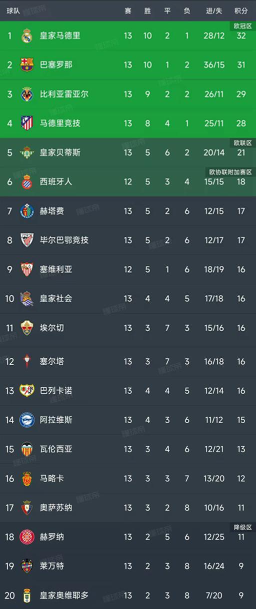 随着皇马22埃尔切,西甲第13轮最新积分榜如下,巴萨落后皇马1分