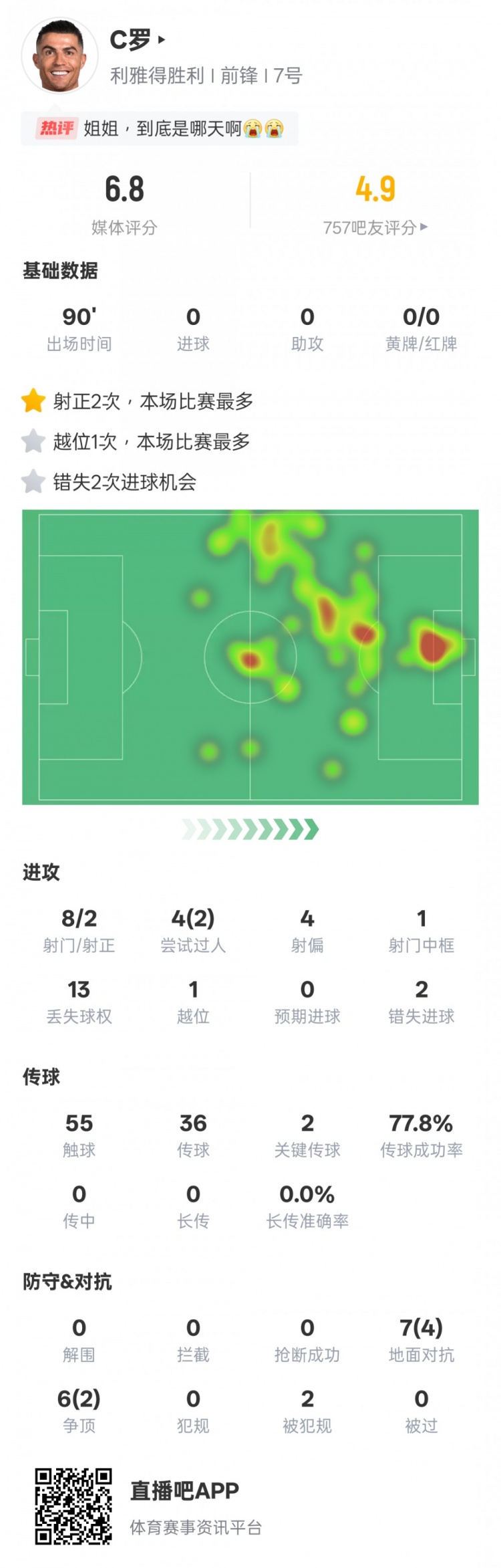 C罗本场比赛数据:2关键传球1中框&错失2次进球机会,评分6.8