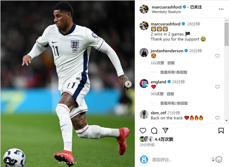 拉什福德重返英格兰队,并连续两场比赛首发出场,他在社交媒体上晒出自己的赛场照片,配文:“两战两胜,感谢你们的支持。”