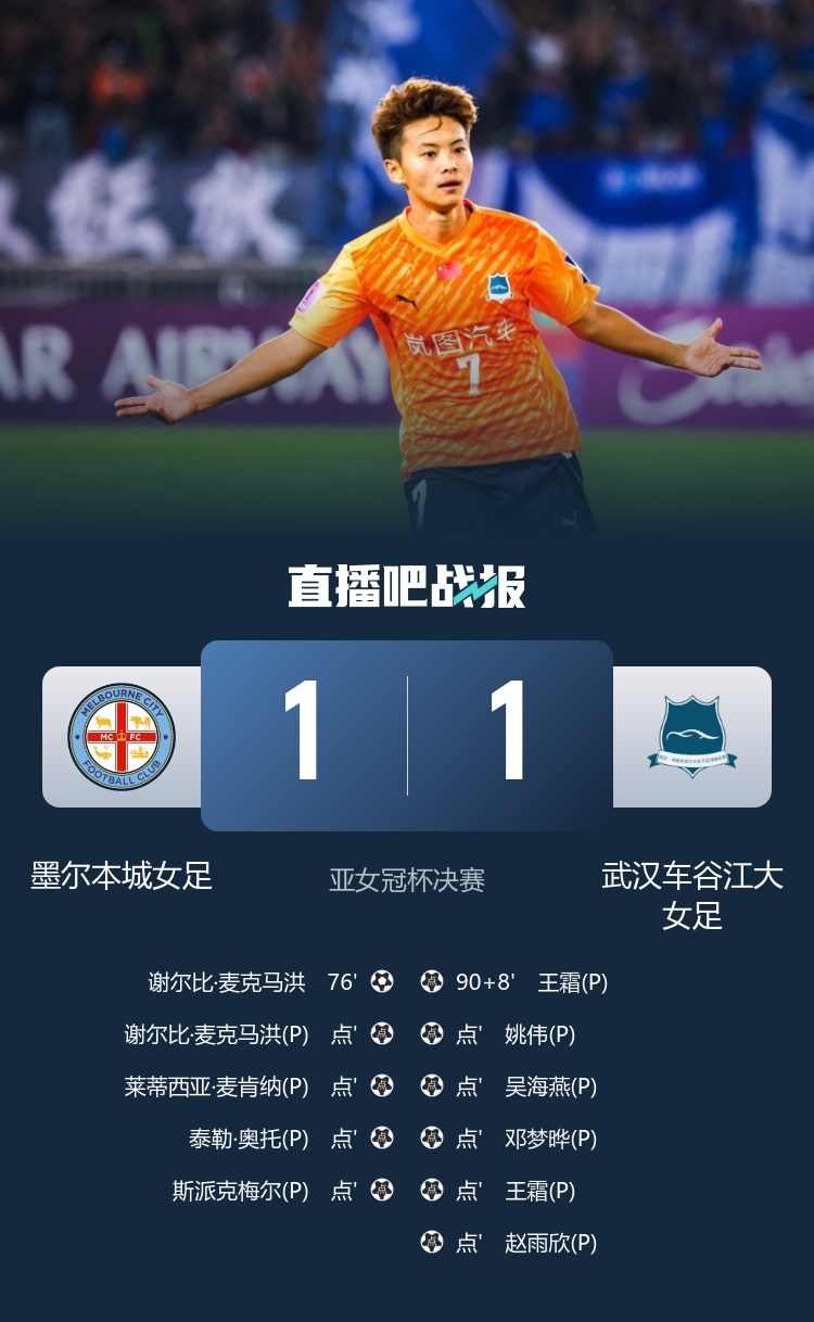 【比赛战报】勇夺首届女足亚冠冠军!武汉女足点球大战胜墨尔本城 陈晨两扑点亚女冠杯决赛,武汉车谷江大女足点球大战战胜墨尔本城女足,夺得首届女足亚冠冠军。阿森纳女足1-0巴萨