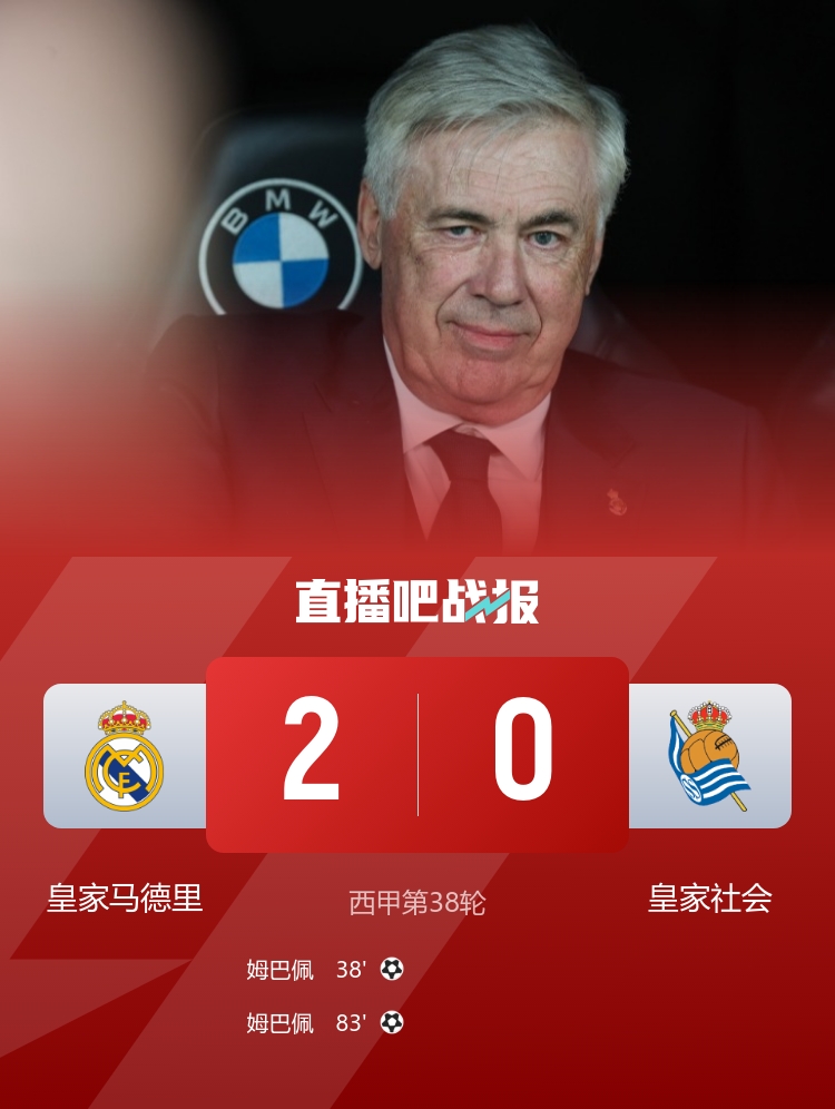 安帅告别战!皇马2-0皇社第二收官 姆巴佩双响魔笛主场最后一舞