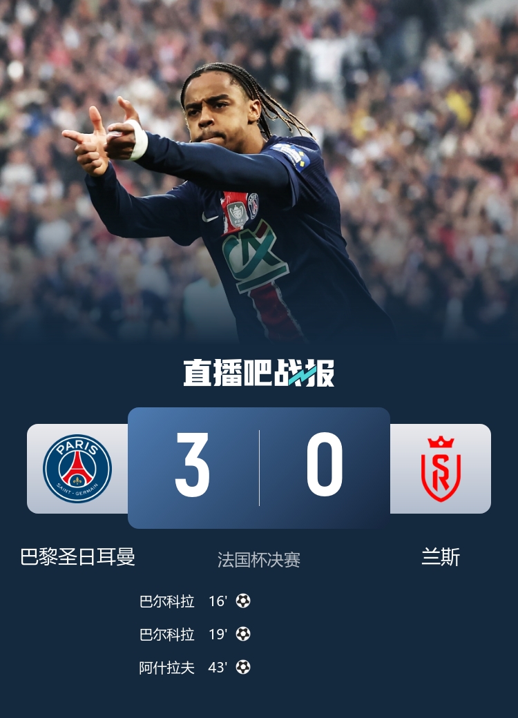 剑指欧冠!巴黎3-0兰斯加冕法国杯&国内夺3冠 巴尔科拉2射1传