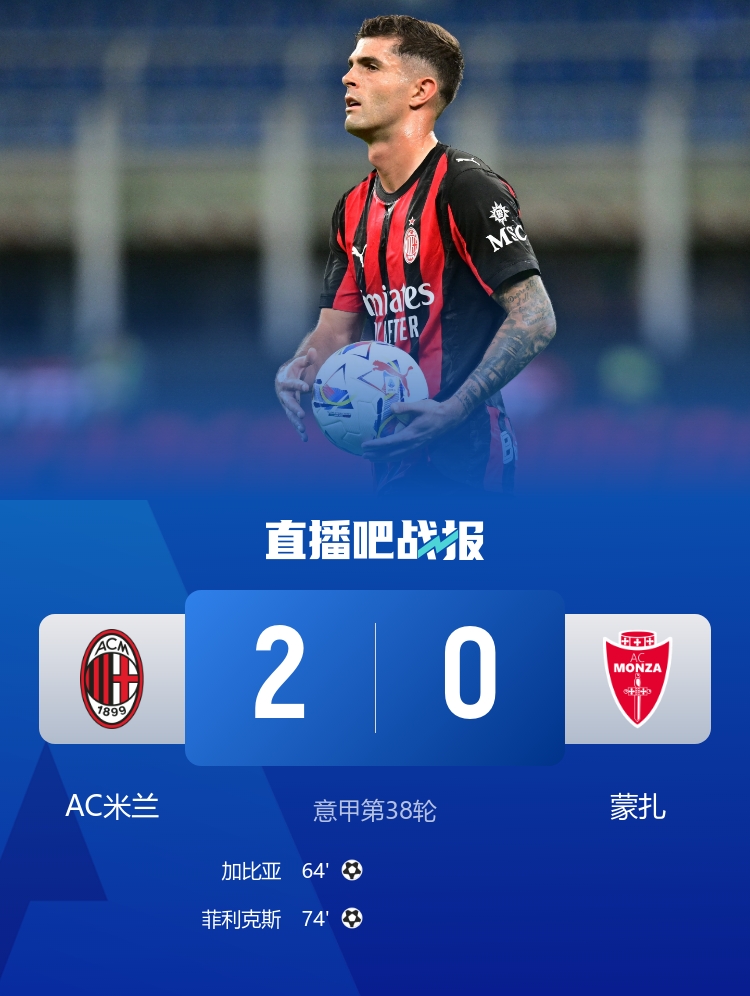 意甲第38轮,AC米兰2-0蒙扎,加比亚破门,菲利克斯任意球。