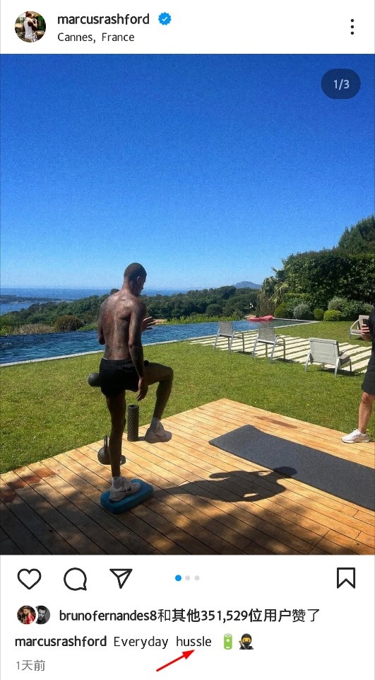6月7日讯 曼联前锋拉什福德在休假期间也没有放松,他仍在训练保持身体状态,定位显示拉什福德目前在法国戛纳。但是他在发社媒动态时闹出了小尴尬,拉什福德想写“everyday hustle