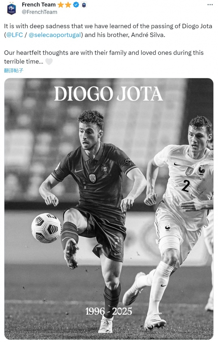 法国队社媒写道:“我们怀着沉痛的心情获悉若塔和他的弟弟安德烈去世。”