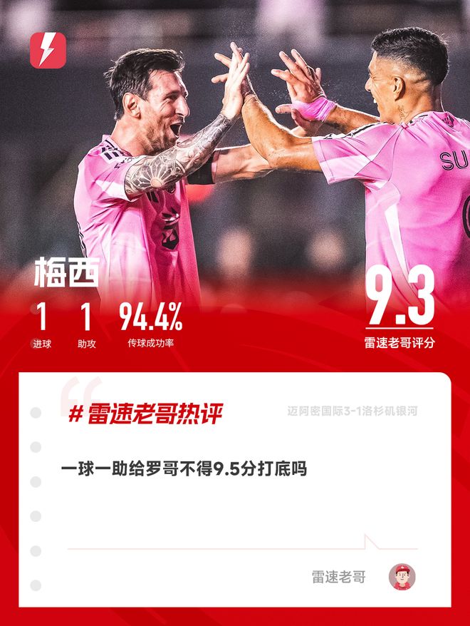 梅西上轮美职联复出,他下半场替补登场便打入一球,并脚后跟妙传苏亚雷斯破门,雷速老哥赛后给出9.3分并犀利评论道:一球一助给罗哥不得9.5分打底吗?