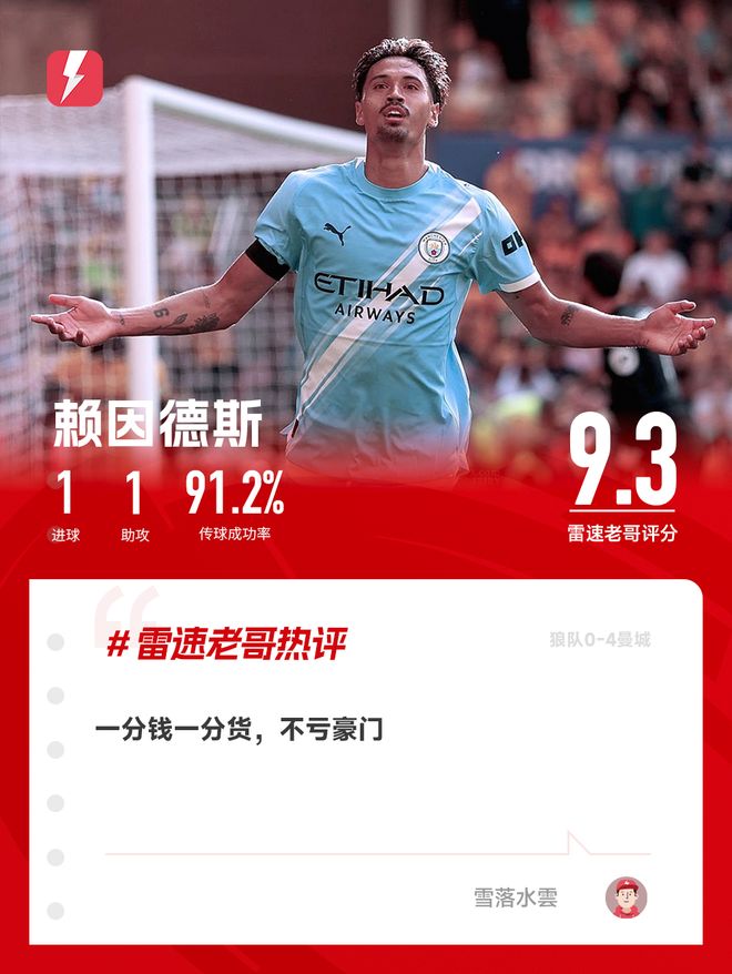 赖因德斯夏窗从米兰转会曼城,英超首秀便征服球迷,贡献一球一助,老哥“雪落水雲”:一分钱一分货,不亏豪门。