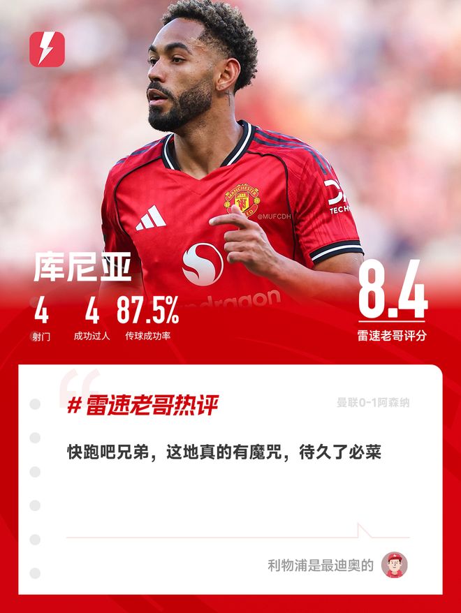 曼联首轮0-1憾负阿森纳,新援库尼亚全场表现亮眼,球迷直言:快跑吧兄弟,这地真的有魔咒,待久了必菜。