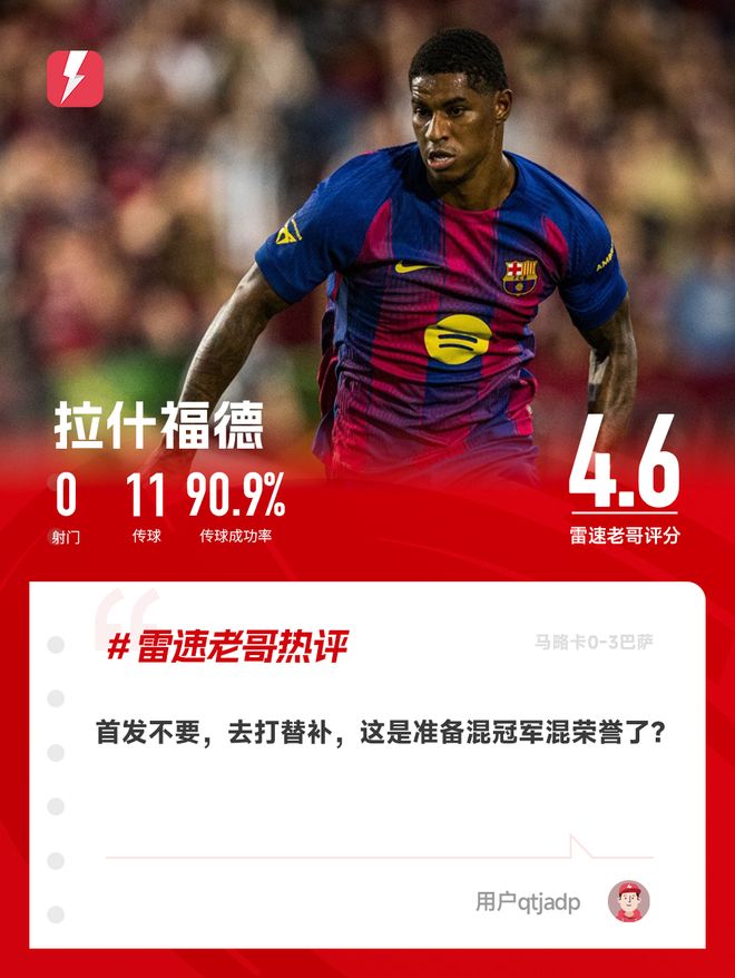 拉什福德今夏租借至梦寐以求的巴萨,首轮西甲替补出战未取得进球,老哥感慨写道:首发不要,去打替补,这是准备混冠军混荣誉了?