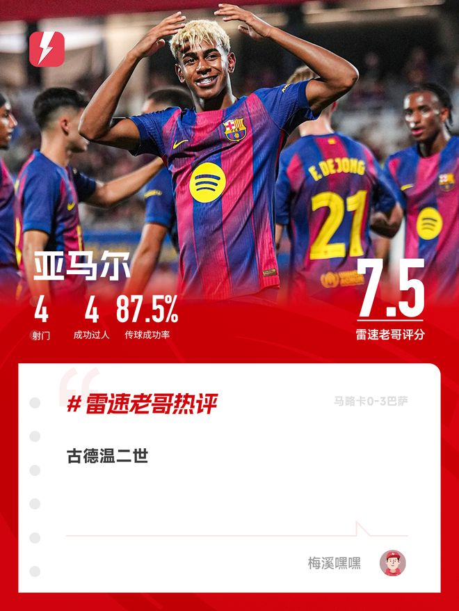 亚马尔首轮补时阶段攻入一球,帮助巴萨3-0完胜,用户“梅溪嘿嘿”称赞:古德温二世!
