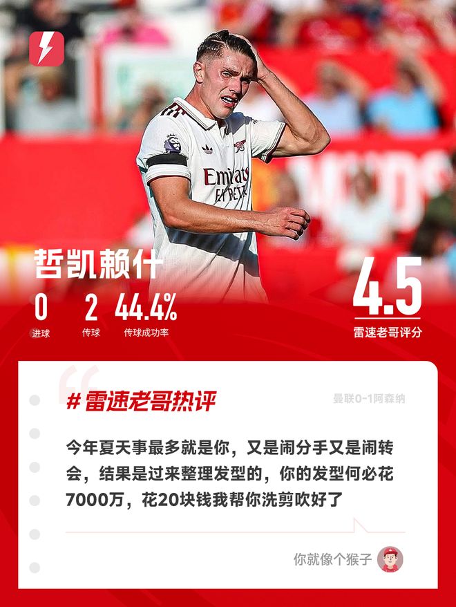 哲凯赖什今夏以总价7350万欧元转会费加盟阿森纳,但是首轮面对曼联头发抢镜,雷速老哥表示:你的发型何必花7000万,花20块钱我帮你洗剪吹好了。