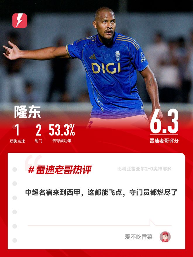 中超名宿隆东从墨超加盟西甲升班马奥维耶多,上半场获得点球良机,但是隆东失点“交了学费”,老哥“爱不吃香菜”点评:中超名宿来到西甲,这都能飞点,守门员都燃尽了。