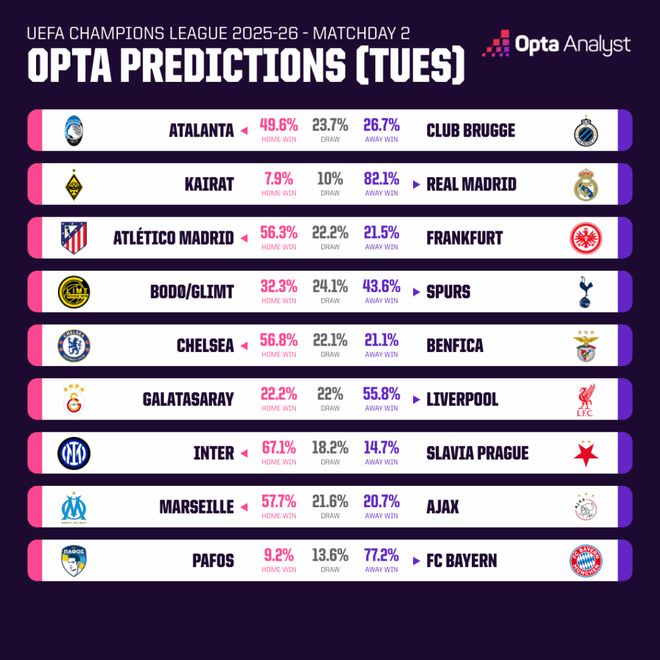 周四的欧冠赛事将以两场超级计算机预测客胜的比赛拉开帷幕。