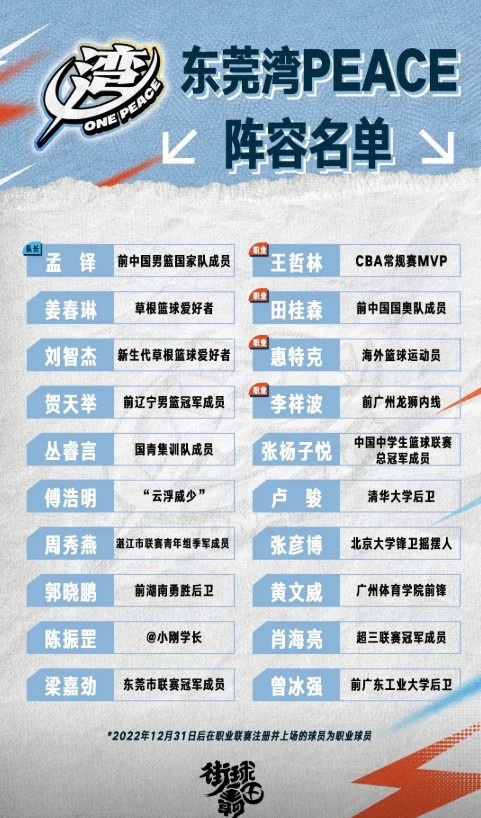 4月13日讯 街球霸王近日公布了新赛季各队的参赛名单,王哲林以及贺天举出现在东莞湾PEACE的名单之中。