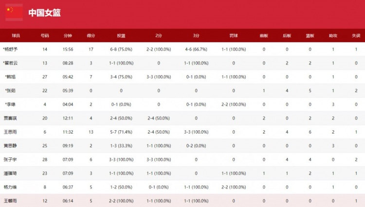 全民皆兵!中国女篮半场12人出场11人有得分进账杨舒予17分最高