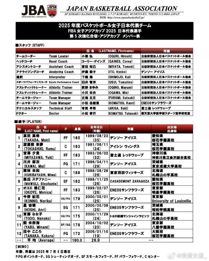 日本女篮今天中午公布了出征女篮亚洲杯的12人大名单。这支队伍平均年龄26.9岁,平均身高1米8,将会是中国女篮卫冕路上的最大障碍。这份名单由高田真希、宫泽夕贵领衔,马瓜-斯蒂