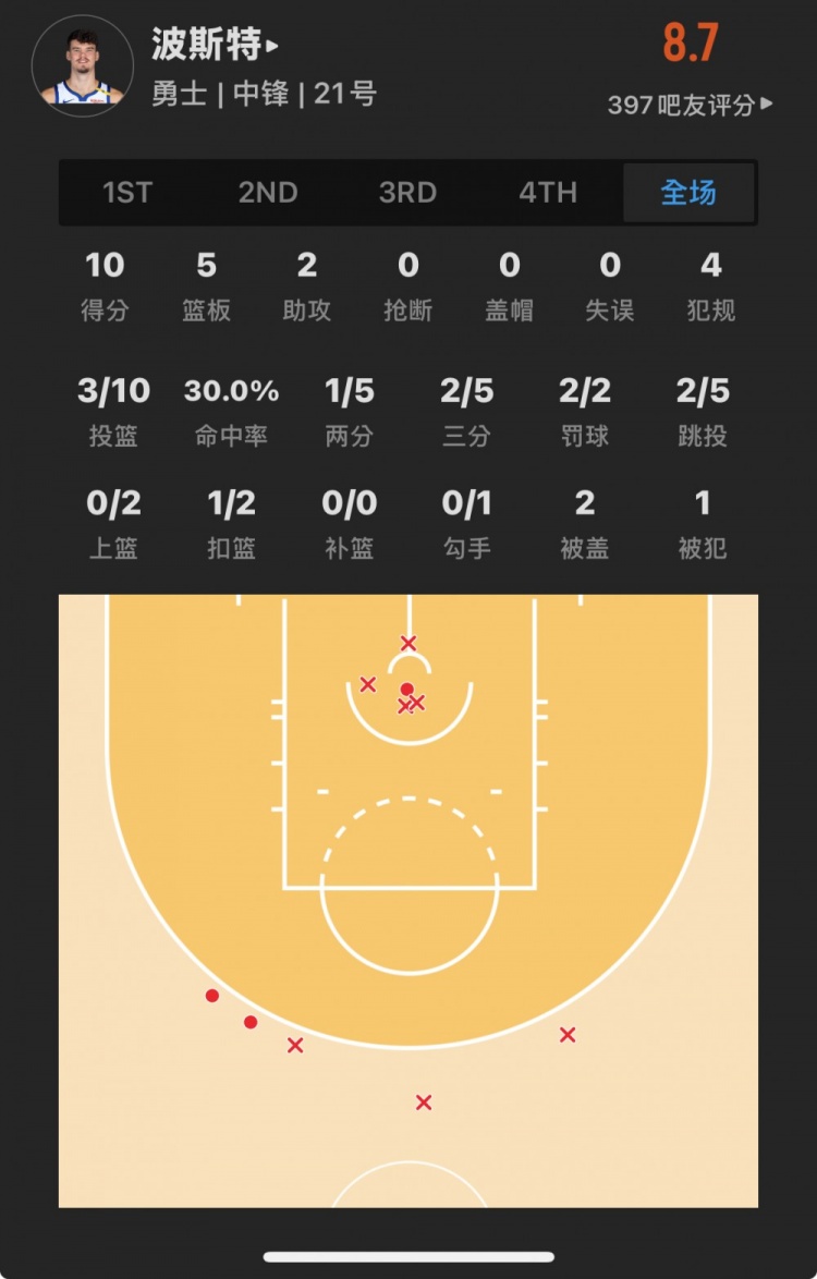 勇士52号秀 昆滕-波斯特 登场16.1分钟