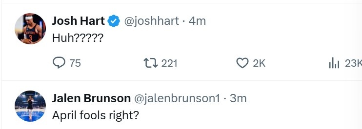 2月2日讯 此前Shams报道,东契奇+克莱伯+莫里斯交易去湖人,换浓眉+克里斯蒂+2029年首轮!对此,尼克斯球星布伦森和哈特直接惊呆了。哈特:哈???布伦森:这是愚人节对吗?