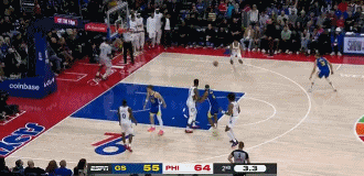 3月2日讯 NBA常规赛,76人半场67-55领先勇士。