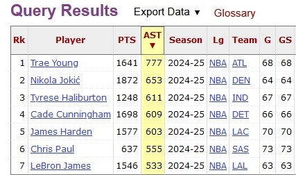 本场过后,特雷-杨本赛季助攻数逼近800,来到796。他也高居赛季助攻榜首位,比第2名约基奇多了143个!榜单前7名如下: