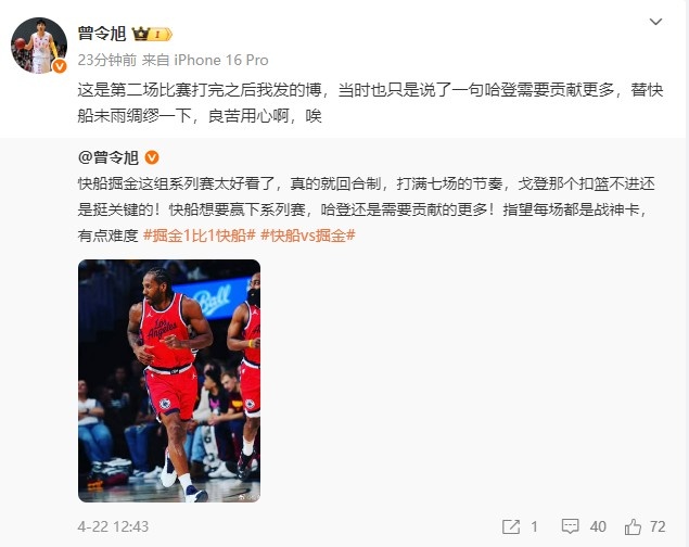 赛后,前CBA球员、现评论员曾令旭更新个人微博,他晒出自己此前写的本组系列赛观点内容,并配文道:“这是第二场比赛打完之后我发的博,当时也只是说了一句哈登需要贡献更多,替快船未雨绸缪一下,良苦用心啊,唉。”