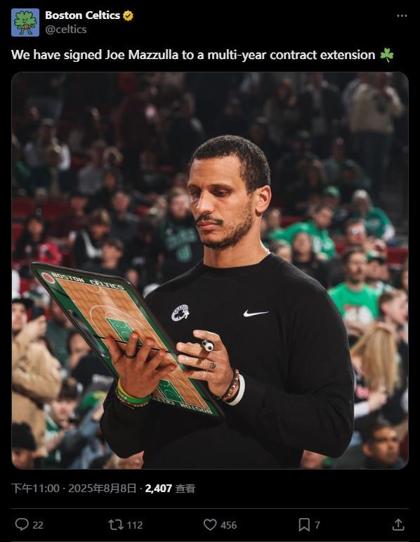 直播吧08月08日讯 今日,凯尔特人官方宣布已经与球队主帅乔-马祖拉签署了一份多年的续约合同。马祖拉2019年正式进入NBA,加入凯尔特人一线队教练组,担任时任主帅布拉德-史蒂文斯