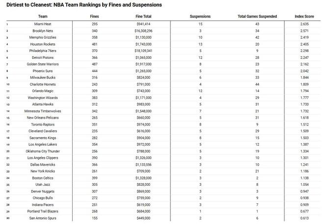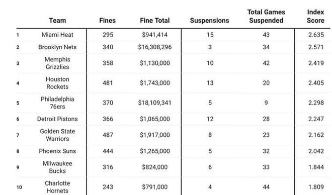 1. 迈阿密热火队 罚款295次 罚金941414美元 停赛15人次 停赛43场
