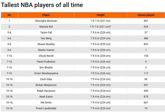 至此,文班亚马成为NBA历史上第10位身高达到2米26及以上的球员(并列历史第7)。NBA历史上最高的球员是乔治·穆雷桑和曼努特·波尔,两人的身高都是2米31。法尔、姚明、布拉德利和弗拉内斯都是2米29,紧随其后。内维特、波德科尔金、布拉和文班亚马同为2米26,并列排名历史第7高。