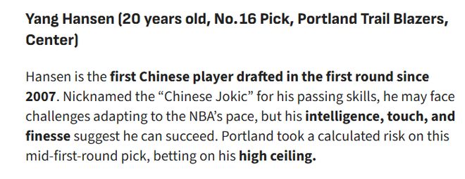 瀚森是2007年以来首位在首轮被选中的中国球员。因出色的传球能力,他被冠以“中国约基奇”的称号。尽管可能面临适应NBA节奏的挑战,但他的球商、手感与技巧都预示着他有能力在联盟立足。开拓者队在首轮中段选中他,是一次经过深思熟虑的冒险,赌的正是他的高上限。