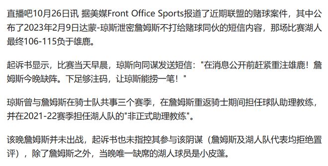 一条泄露勒布朗·詹姆斯伤情的短信,掀起了NBA近年来最大的赌球风暴,“在消息公开前赶紧重注雄鹿!詹姆斯今晚缺阵,下足够注码,让琼斯能捞一笔!”这是2023年2月9日早晨,前NBA球员达蒙·琼斯发给同伙的短信内容,当天晚上,湖人果然以106-115负于雄鹿,而詹姆斯确实未出战,这条直白而贪婪的短信,随着FBI近日公布的起诉书细节,将NBA隐秘的赌球暗流彻底暴露在公众面前