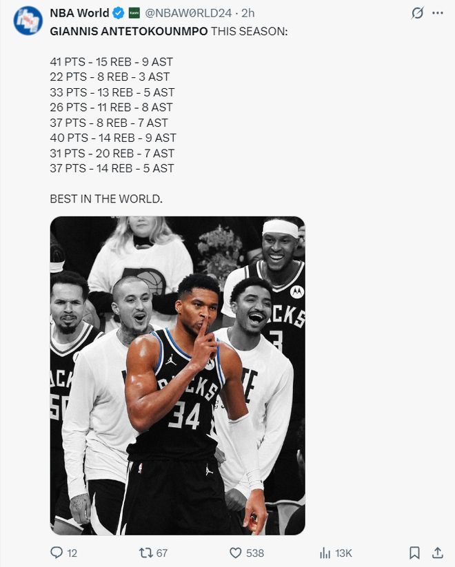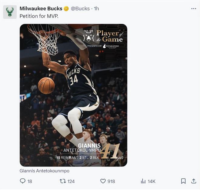 末节19分万夫莫敌!字母哥41+15又刷纪录美媒晒数据赞世界最强