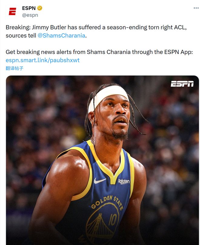 北京时间2026年1月20日下午,ESPN消息,据NBA著名记者Shams报道,勇士大将巴特勒遭遇右膝前十字韧带撕裂,赛季报销。