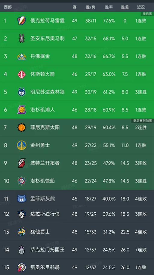 北京时间1月30日,今日的NBA常规赛结束了所有比赛,我们看看西部最新积分榜变动!雷霆111-123不敌森林狼,掘金107-103险胜篮网,太阳114-96战胜活塞,独行侠121-123憾负黄蜂,火箭104-86