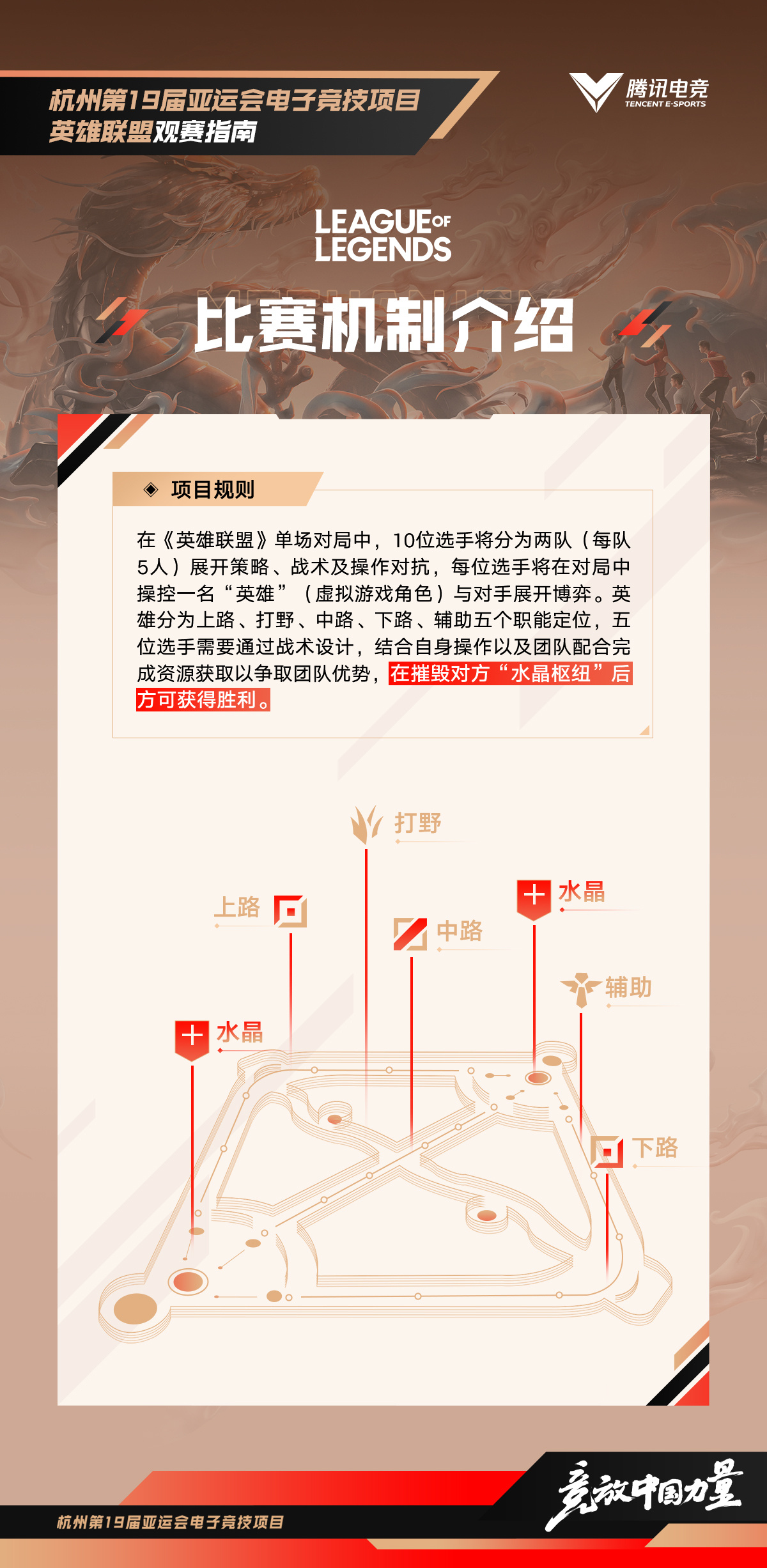 在《英雄联盟》单场对局中,10位选手将分为两队 (每队5人)展开策略、战术及操作对抗,每位选手将在对局中操控一名“英雄”(虚拟游戏角色)与对手展开博弈。英雄分为上路、打野、中路、下路、辅助五个职能定位,五位选手需要通过战术设计,结合自身操作以及团队配合完成资源获取以争取团队优势,在摧毁对方“水晶枢纽”后方可获得胜利。
