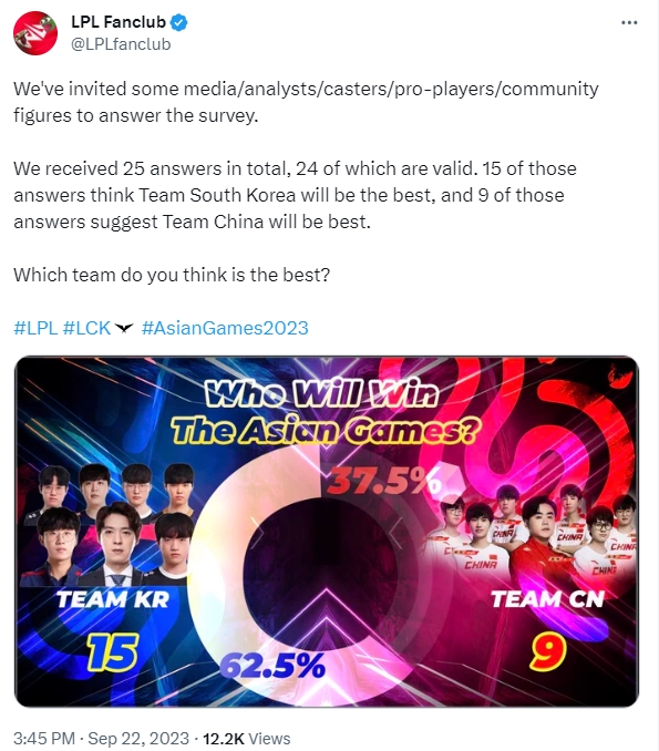 9月22日讯 杭州亚运会将于2023年9月23日正式开幕,英雄联盟项目无疑是电竞项目中最受关注的比赛之一,而夺冠热门分别是中国队与韩国队,今日LPL粉丝俱乐部官方在推特上发布了问卷调查。他们邀请了一些媒体/分析师/解说/职业选手/社区人物来讨论中国队与韩国队的阵容强度,他们一共收到25个答案,其中24个是有效的,6成认为韩国队更强,4成则认为中国队更强。