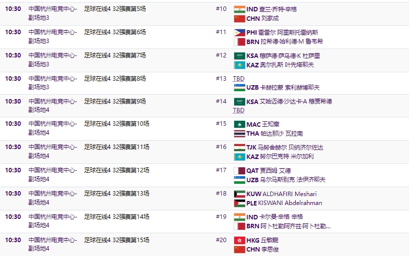 9月22日讯 今日杭州亚运会官网更新了24日电子竞技项目赛程,中国足球在线4选手将会率先登场,10:30刘家成将在32强赛对阵印度选手查兰·乔特·辛格,李思俊的对手则是中国香港选手丘敏龍。