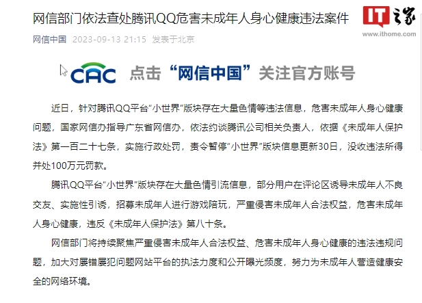 近日,针对腾讯 QQ 平台“小世界”版块存在大量色情等违法信息,危害未成年人身心健康问题,国家网信办指导广东省网信办,依法约谈腾讯公司相关负责人,依据《未成年人保护法》第一百二十七条,实施行政处罚,责令暂停“小世界”版块信息更新 30 日,没收违法所得并处 100 万元罚款。