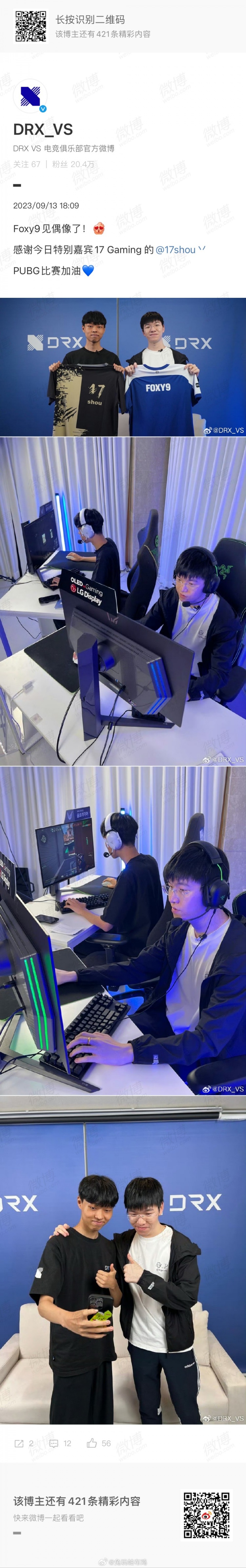9月13日讯 今日DRX VS电竞俱乐部官方微博更新,发布17shou在韩国瓦分部交换队服的照片,并配文:Foxy9见偶像了!感谢今日特别嘉宾17 Gaming的17shou,PUBG比赛加油!