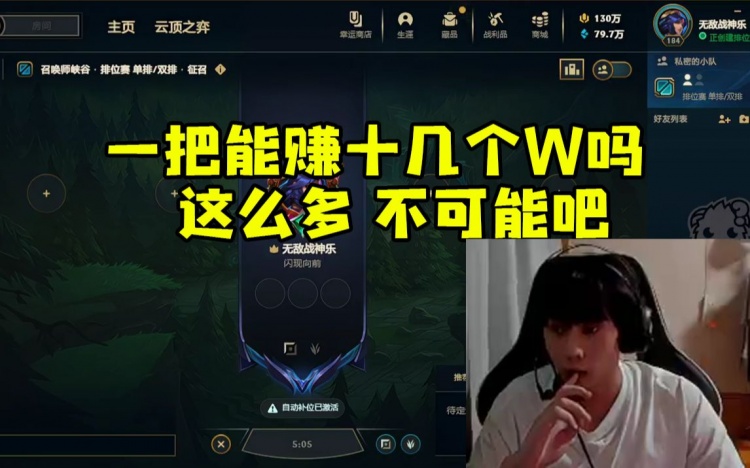 9月14日讯 近日EDG上单选手Ale开播直播国服排位,在回应弹幕问题时得知自己被开票,震惊回复道:一把能十几个W吗?不可能吧!