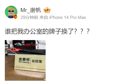 09月14日讯 Doinb公会老板谢帆发布了一张图片,图片中写着“金泰相丨总经理”,谢帆微博写道“谁把我办公室的牌子换了???”相关阅读:太仓起义!谢帆当串子被Doinb发现,万磊拱火:金社长