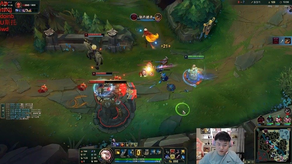 9月14日讯 近日Doinb开播和Ale、Uzi等好友组排,在其中一盘对局中Ale奥恩前期被单杀后,上路背靠防御塔1V2取得双杀找回场子,如此壮举也引得队友纷纷调侃。
