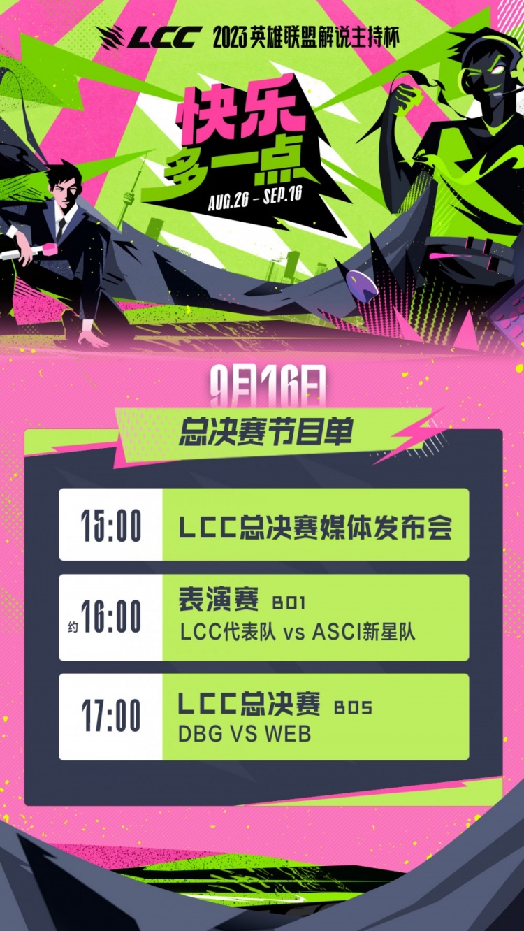 9月15日讯 英雄联盟赛事官博更新,公布了2023英雄联盟解说主持杯总决赛9月16日节目单,原文如下:15:00 LCC总决赛媒体发布会
