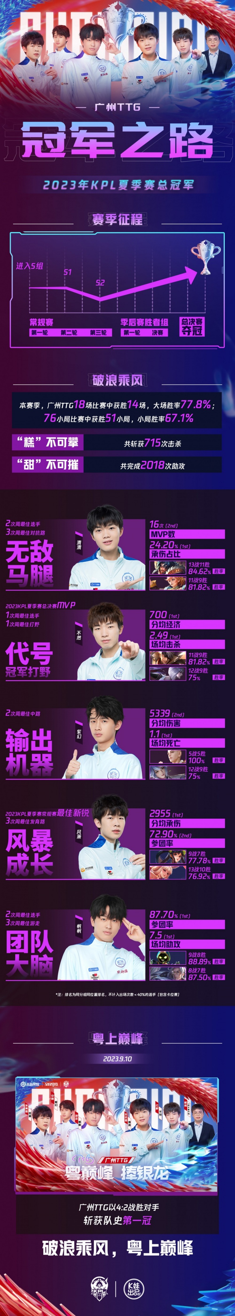 2023年的夏天是属于广州TTG的,他们以大场77.8%、小局67.1%的胜率一路过关斩将,最终在总决赛4:2击败对手勇夺冠军!这是他们队史首冠,也是这支首发队伍的首冠。一路披荆斩棘,广州TTG写下了属于自己的篇章!